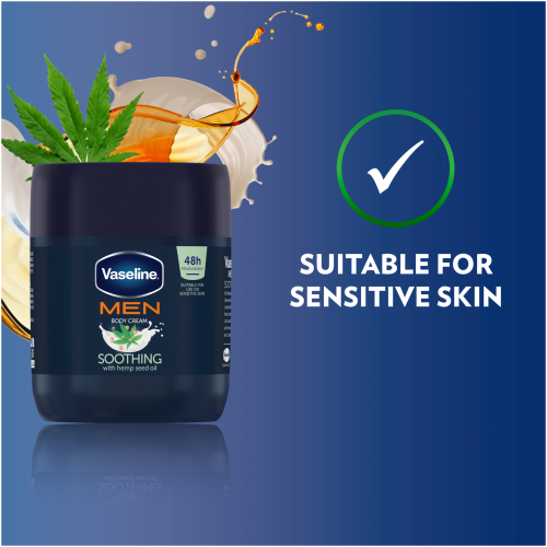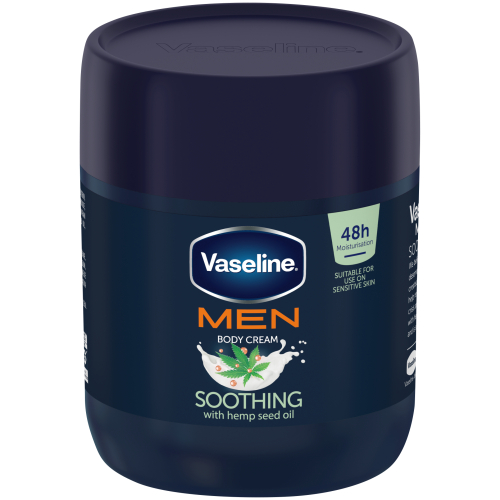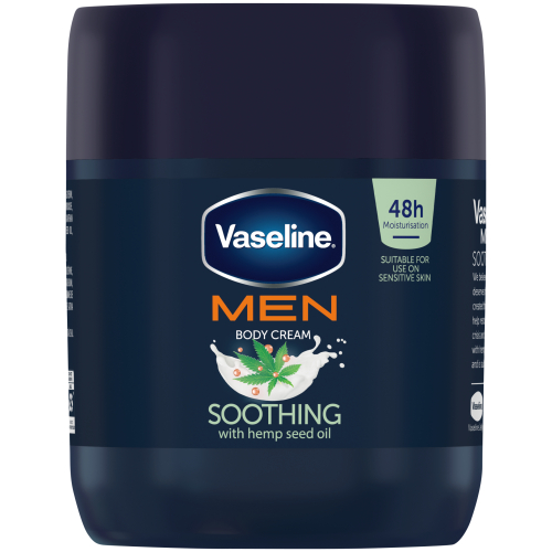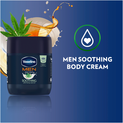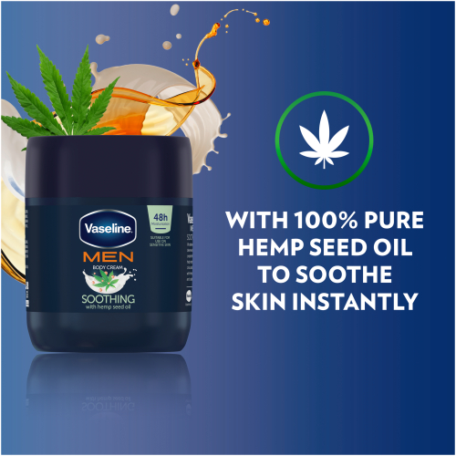 Vaseline® MEN Soothing Body Cream with Hemp Seed Oil provides long lasting hydration and soothes skin.
